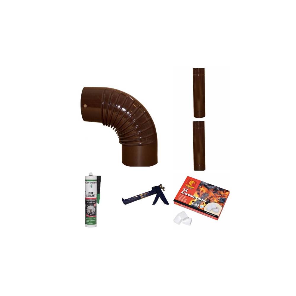 Burlan 90cm/120mm x 2 + Cot emailat evacuare fum, Q120 mm + Etansant Den Braven Fire Sealant, negru, rezistent la temperatura, 280 ml + Pistol silicon din metal, albastru + Pastile aprins focul albe, 32buc/cutie