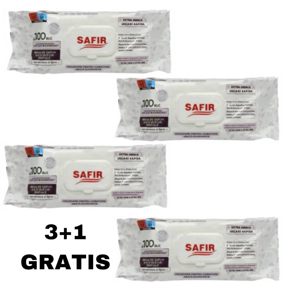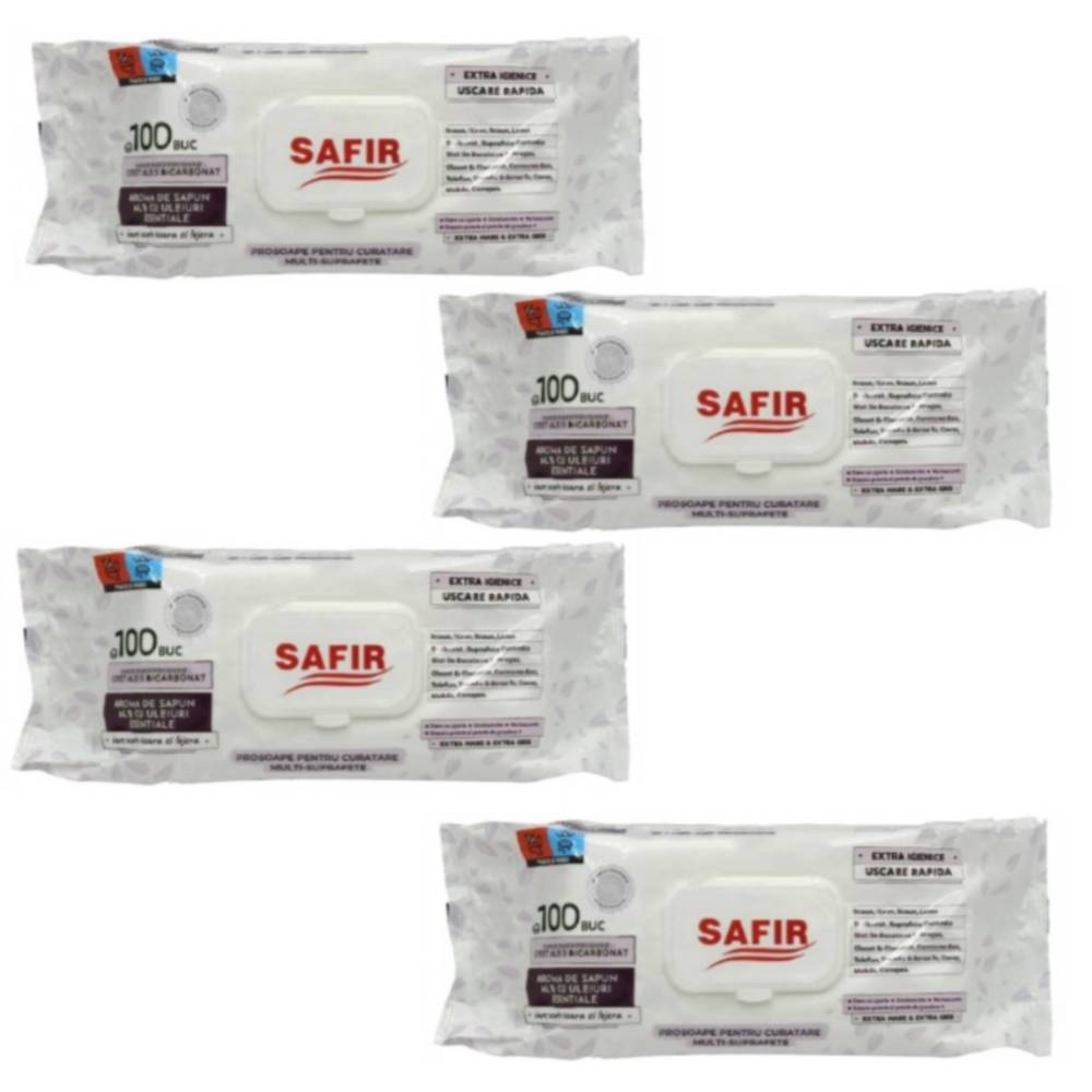 Pachet servetele cu bicarbonat si otet (umede), Safir, 100 buc, 3+1 gratis